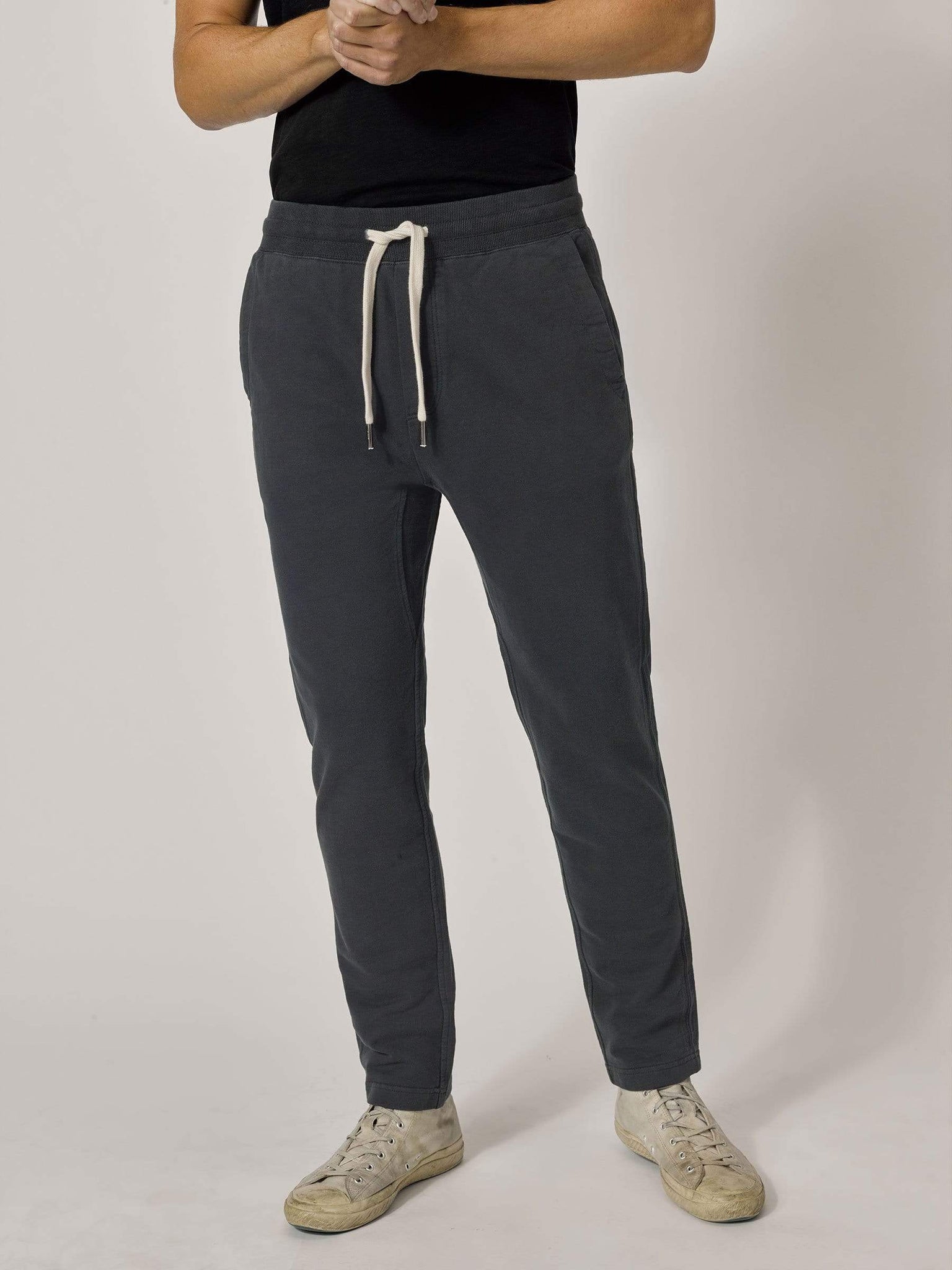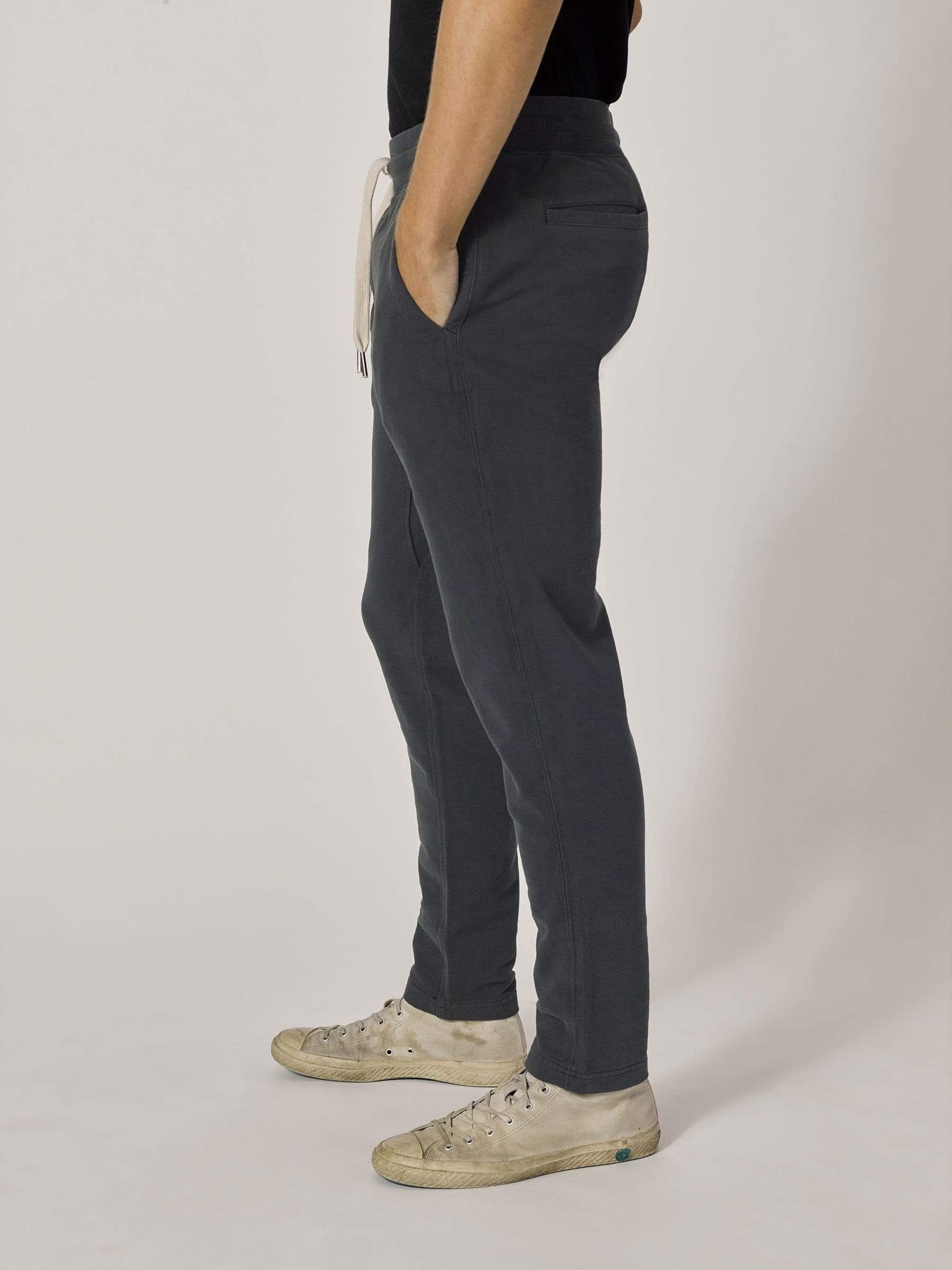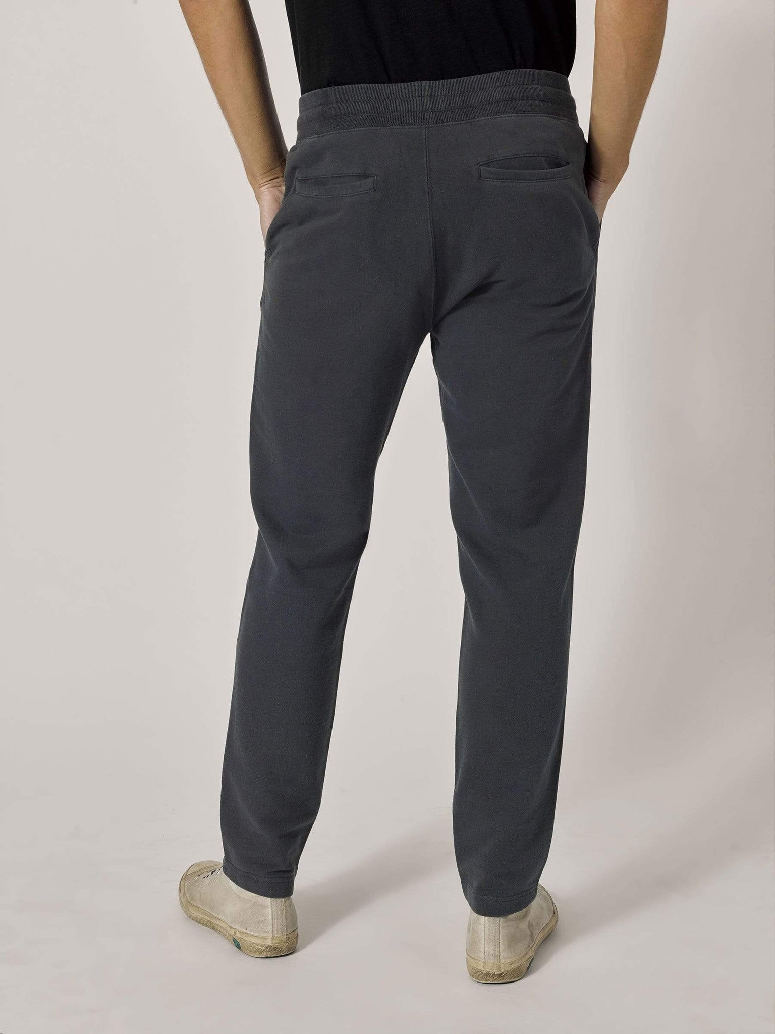 A slim fit, knit trouser cut from loop-back terrycloth. The outside of the fabric is soft and flat, brushed for added warmth, with a looped, towel-like interior. The side seams are constructed with a durable flat lock stitch, with twill tape for added strength. With front and back pockets, comfortable fabric, and tailored fit, these trousers are great for travel or wearing around the house.