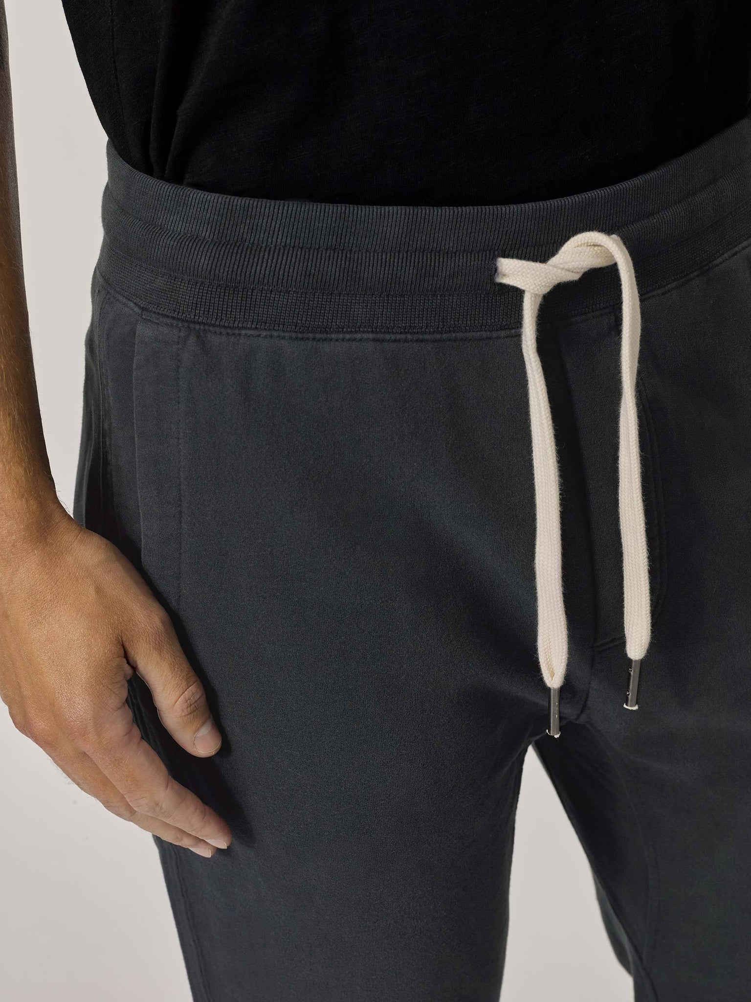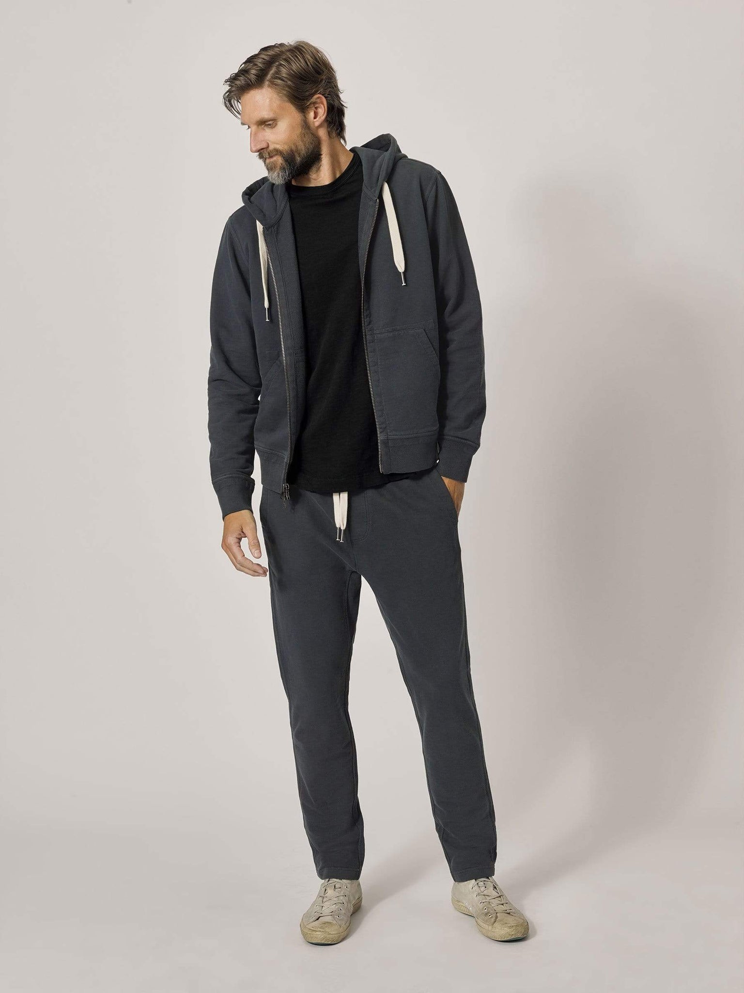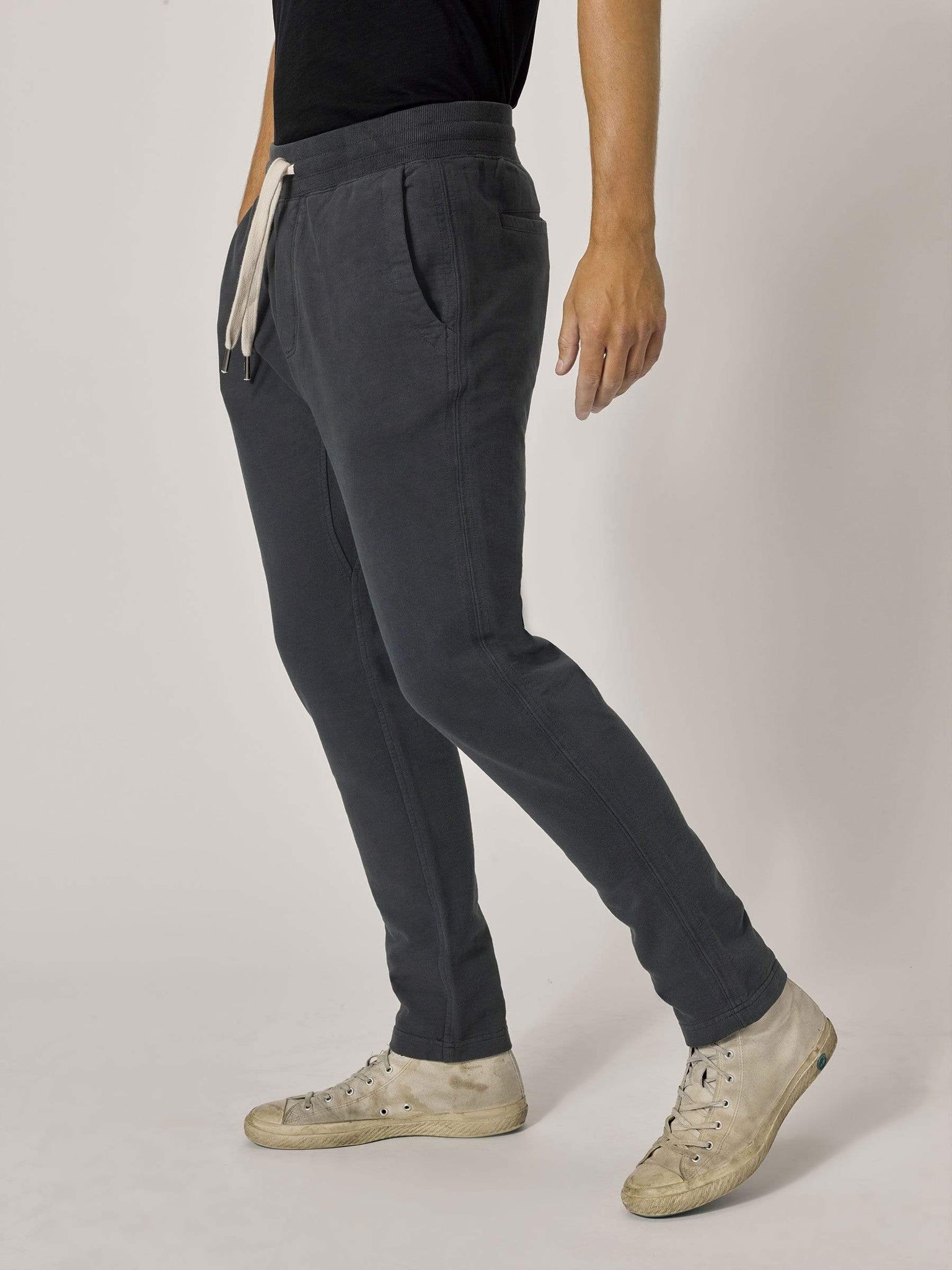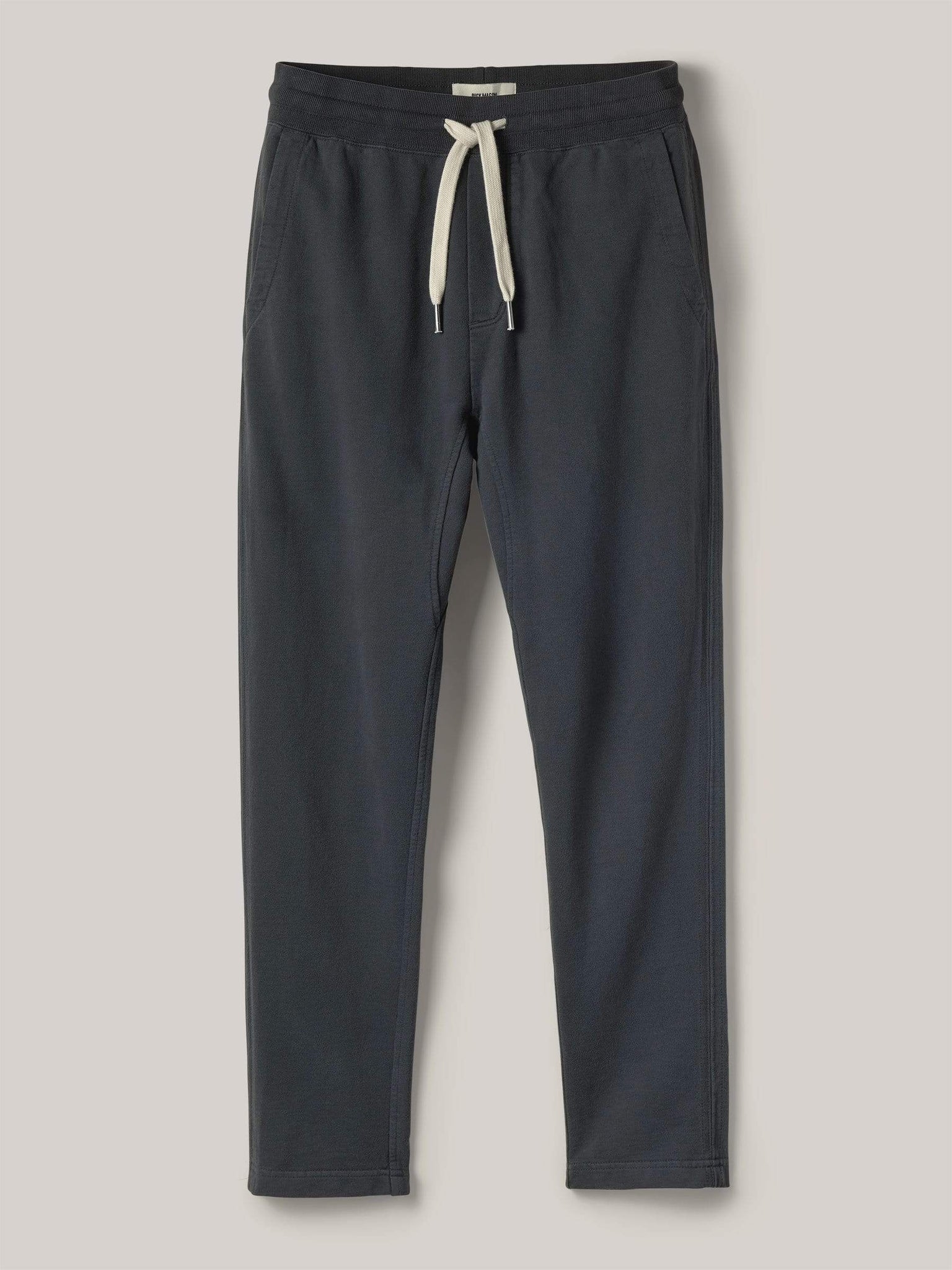 A slim fit, knit trouser cut from loop-back terrycloth. The outside of the fabric is soft and flat, brushed for added warmth, with a looped, towel-like interior. The side seams are constructed with a durable flat lock stitch, with twill tape for added strength. With front and back pockets, comfortable fabric, and tailored fit, these trousers are great for travel or wearing around the house.