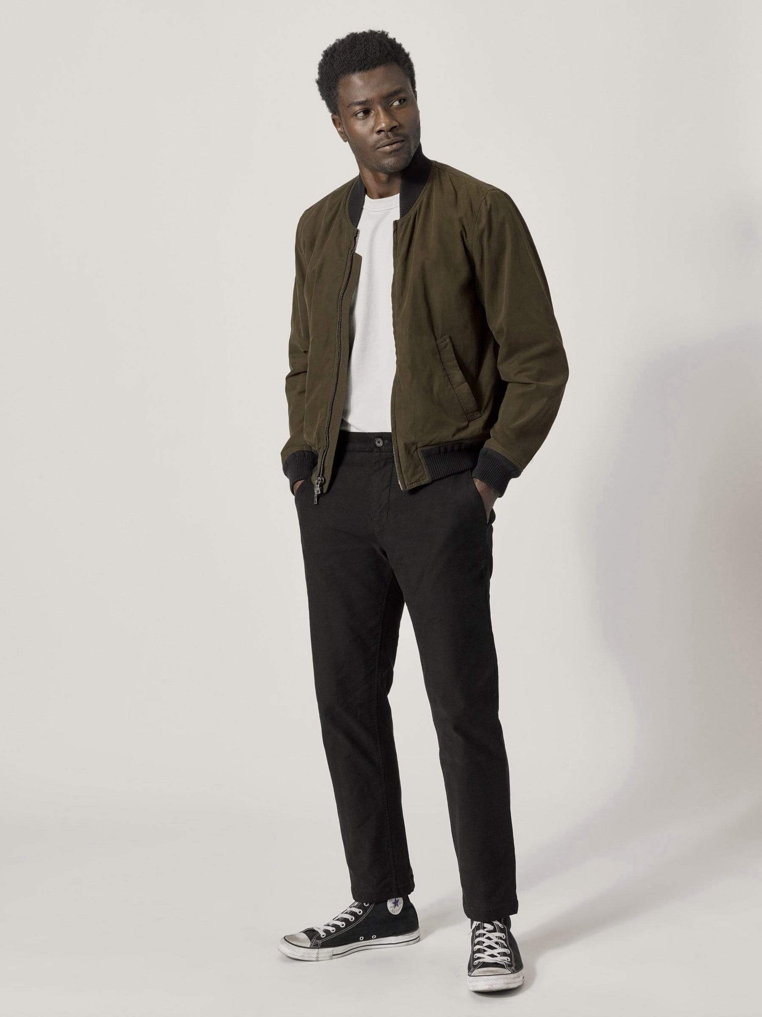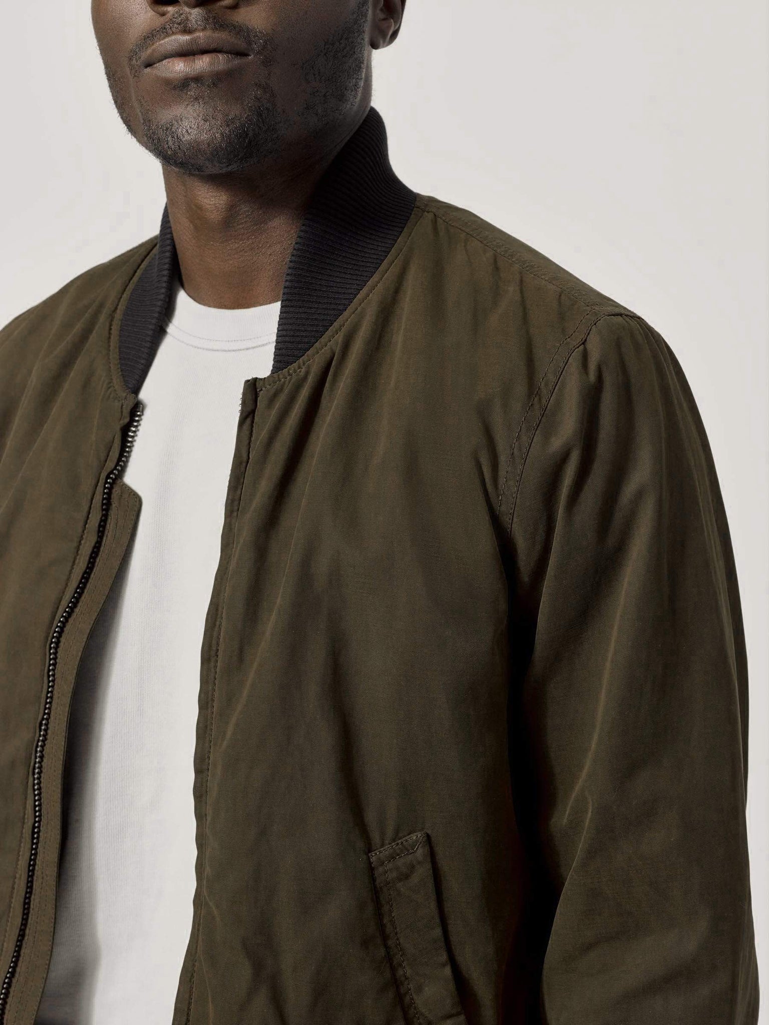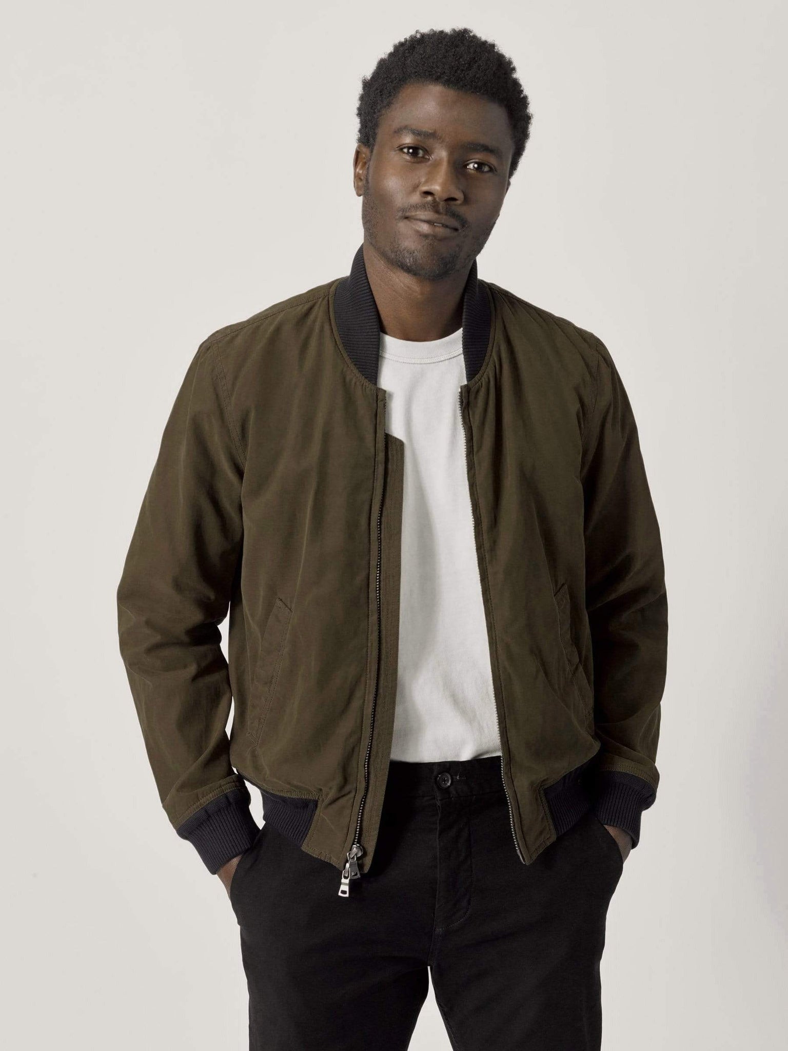 A fully-lined, full-fitting bomber jacket cut from lightweight, blended fabric with a water repellent waxed finish. We love the time-tested silhouette of a bomber, but we wanted to make it in a year-round fabric. This style comes with angled hip pockets (with soft, corduroy pocket bags), articulating, 2-piece sleeves with elbow pleats (for added mobility), and a comfortable, quilted lining. We cut this jacket in a lightweight blended fabric with a wax finish, and heat-gunned the seams for added water-repellency. It’s got all the style of an old-school bomber, with a fraction of the bulk.