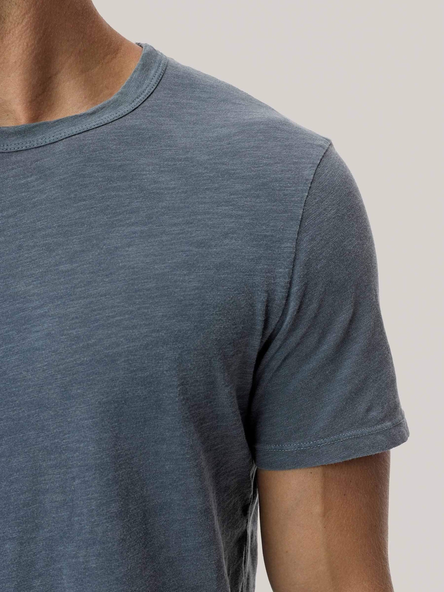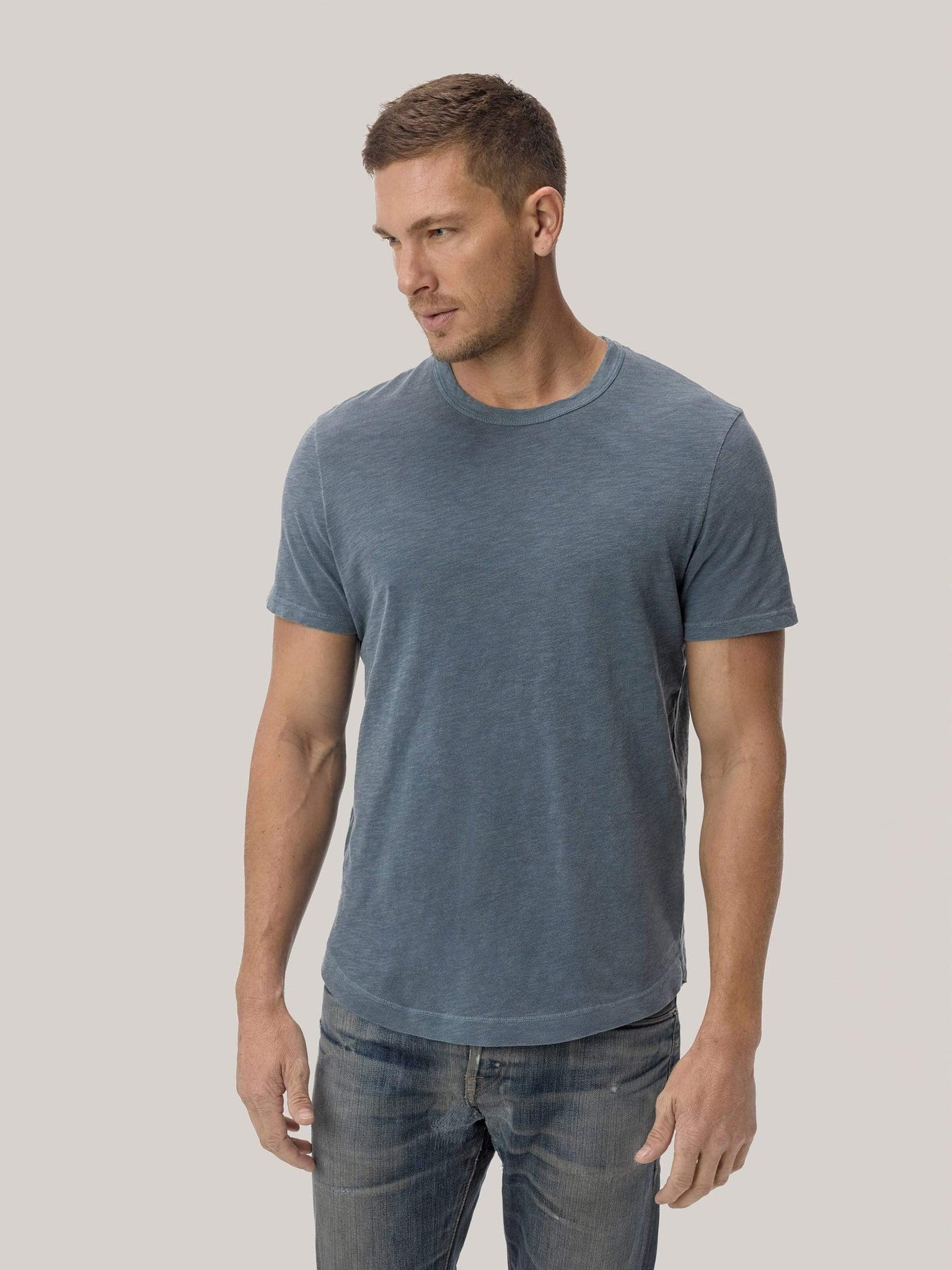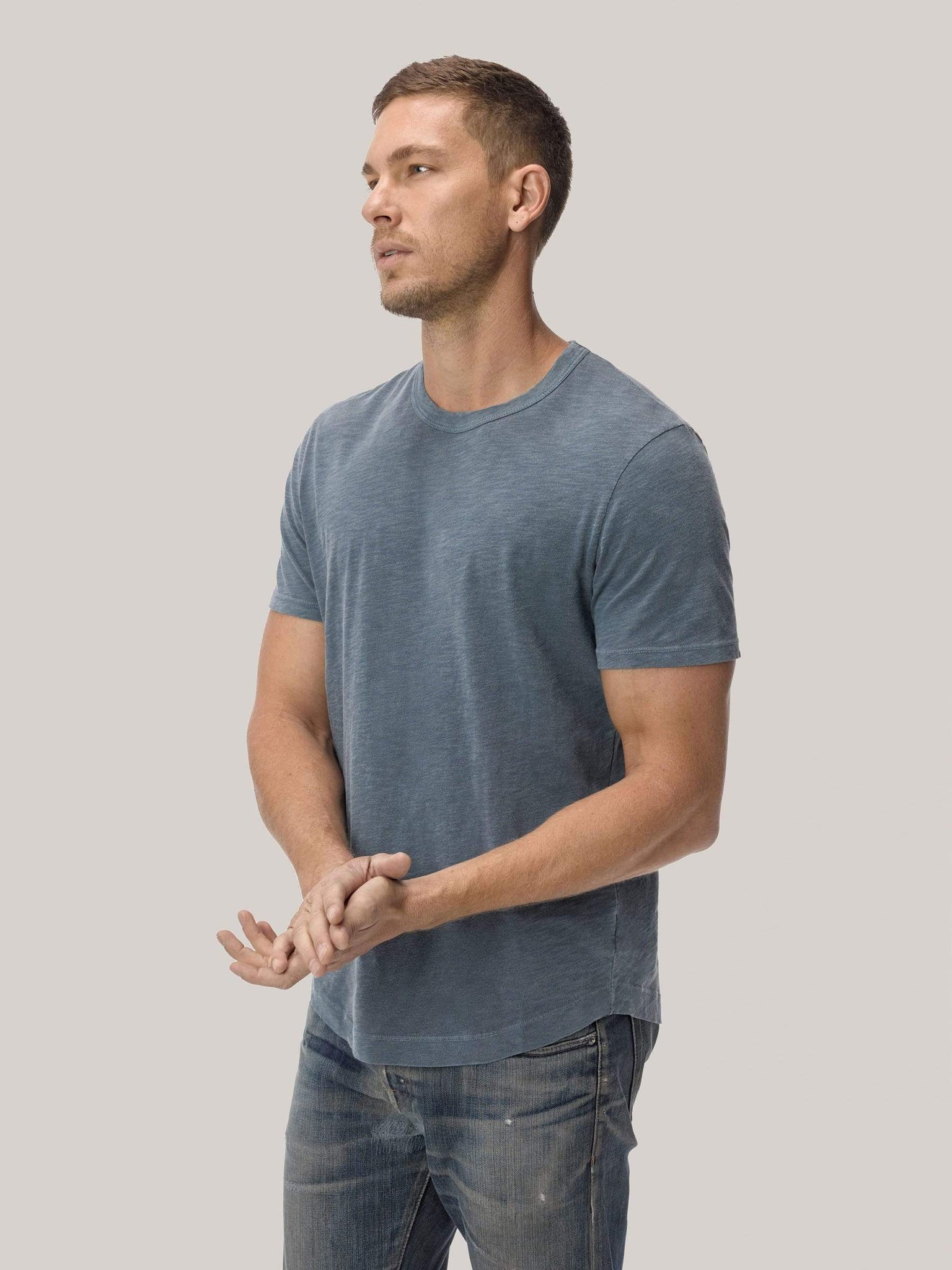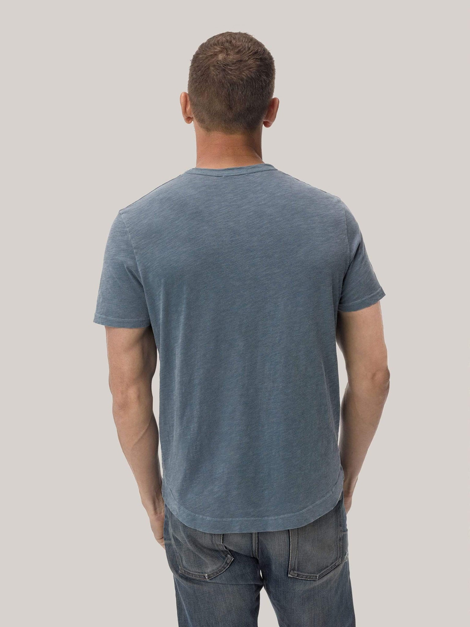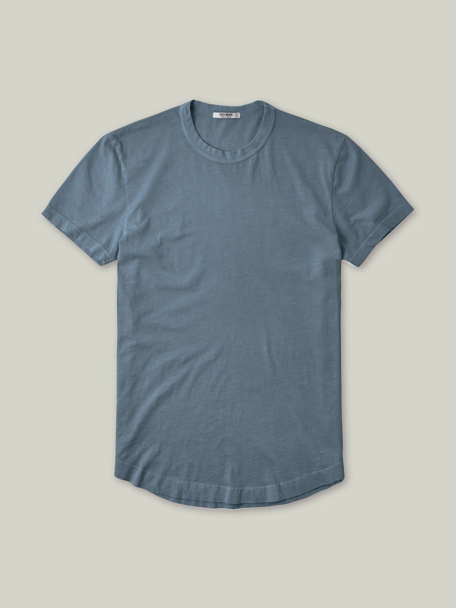 Our slub curved hem tee is built entirely from slub cotton. Slub is lightly textured fabric made on small batch, low-tension looms. Our Venice Wash targets cellulose fibers in cotton, resulting in unparalleled softness and incredible drape. The rounded shirttail lends a tailored look to an everyday essential.