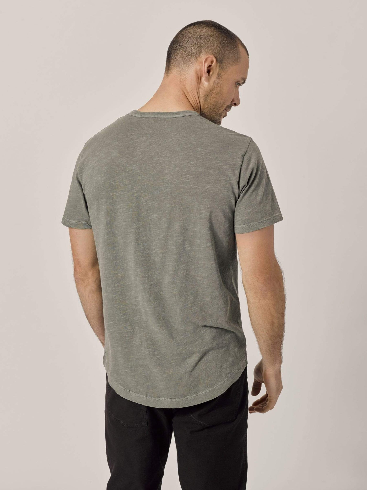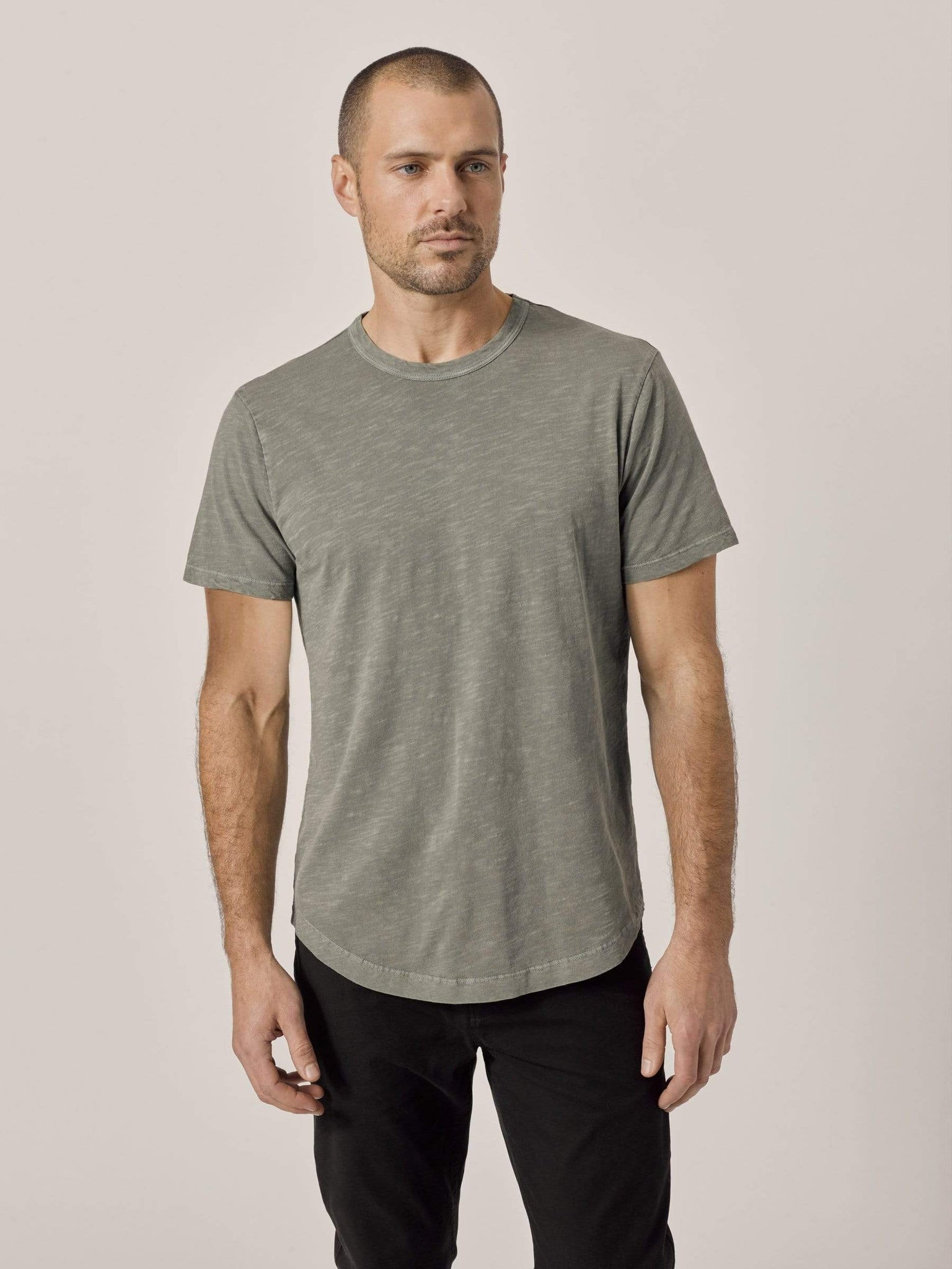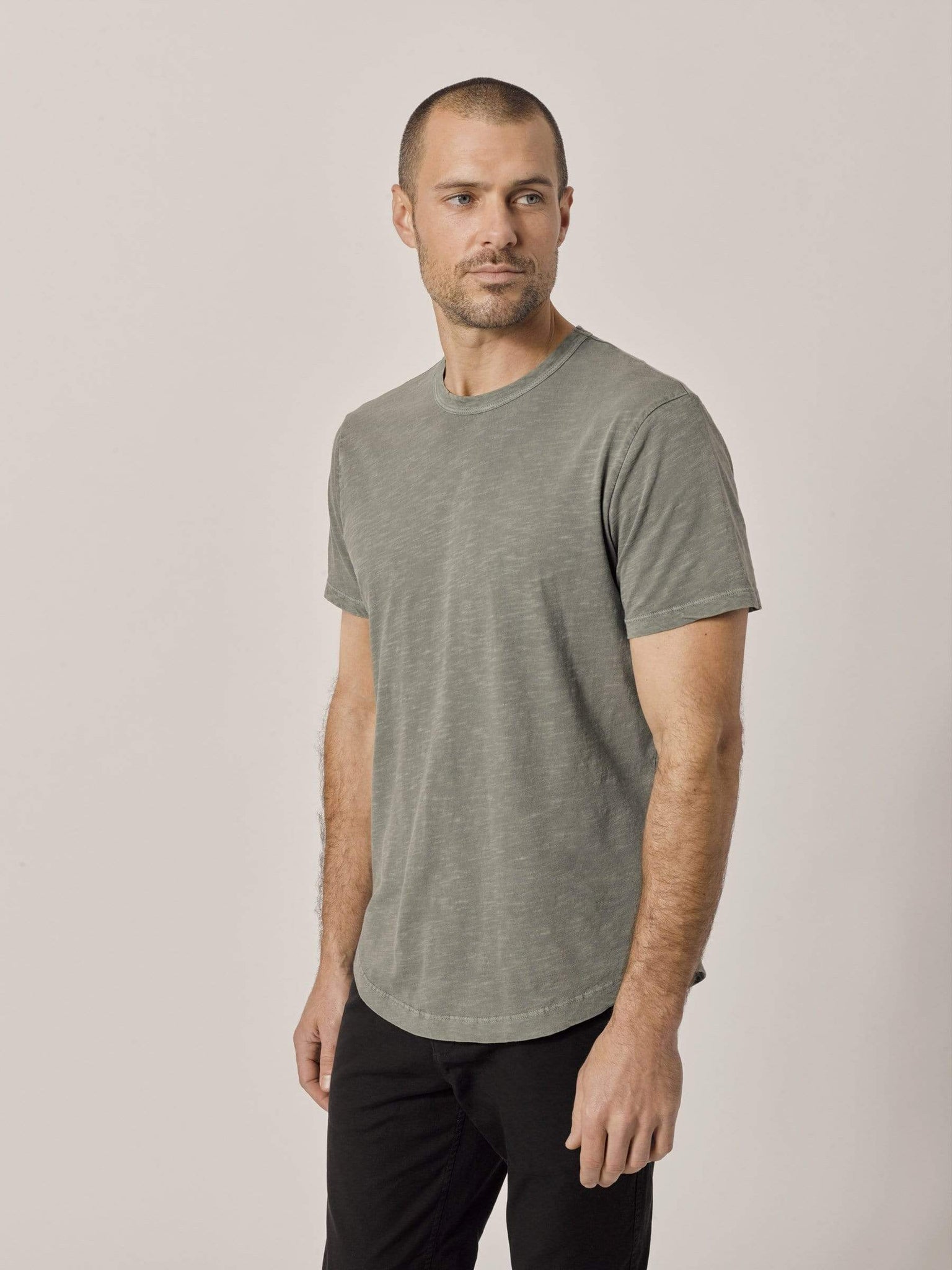 Our crew tee is built entirely from slub cotton. Slub is lightly textured fabric made on small batch, low-tension looms. Our Venice Wash targets cellulose fibers in cotton, resulting in unparalleled softness and incredible drape. The rounded shirttail lends a tailored look to an everyday essential.