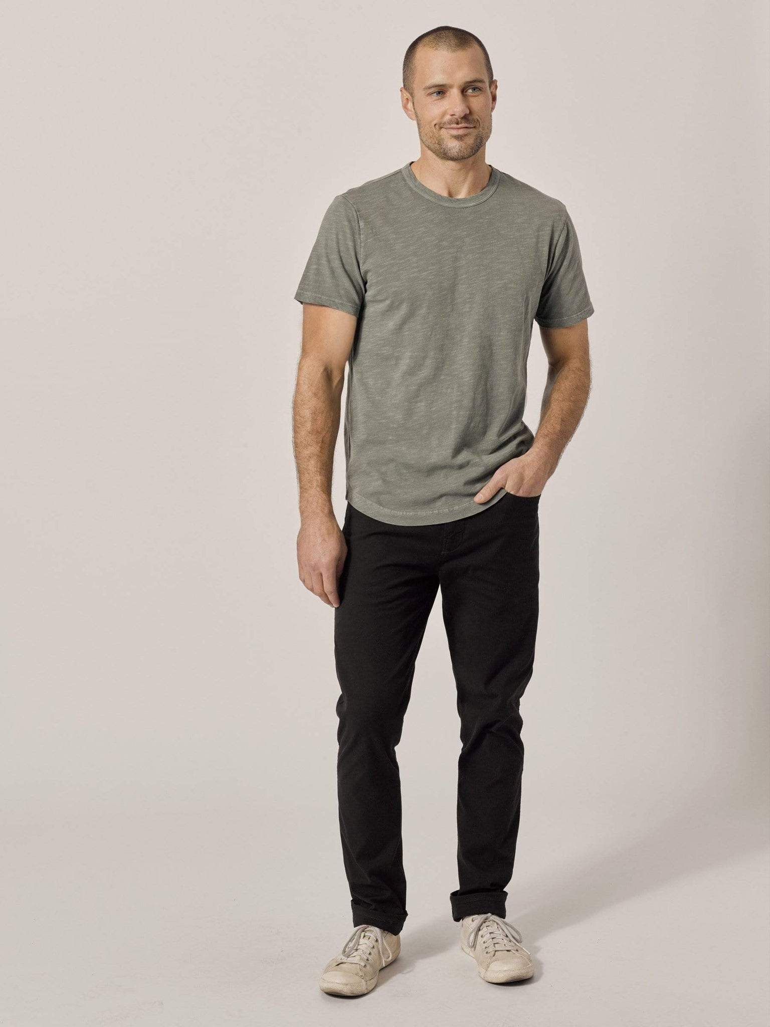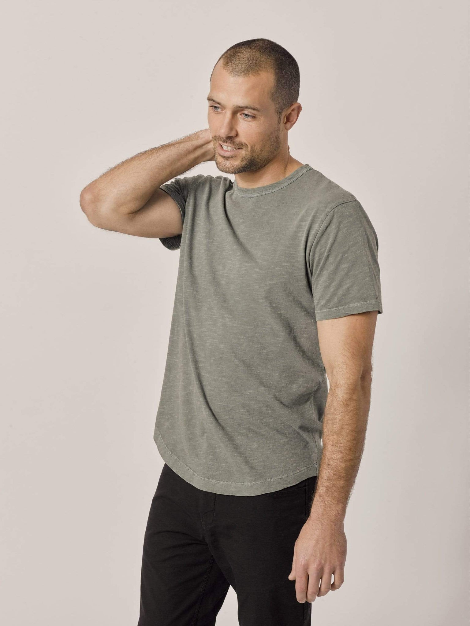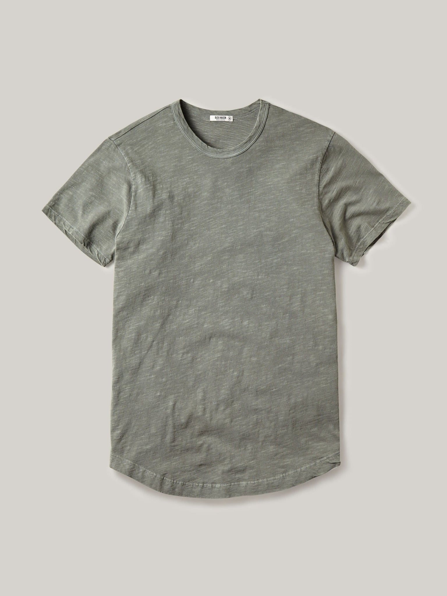 Our crew tee is built entirely from slub cotton. Slub is lightly textured fabric made on small batch, low-tension looms. Our Venice Wash targets cellulose fibers in cotton, resulting in unparalleled softness and incredible drape. The rounded shirttail lends a tailored look to an everyday essential.