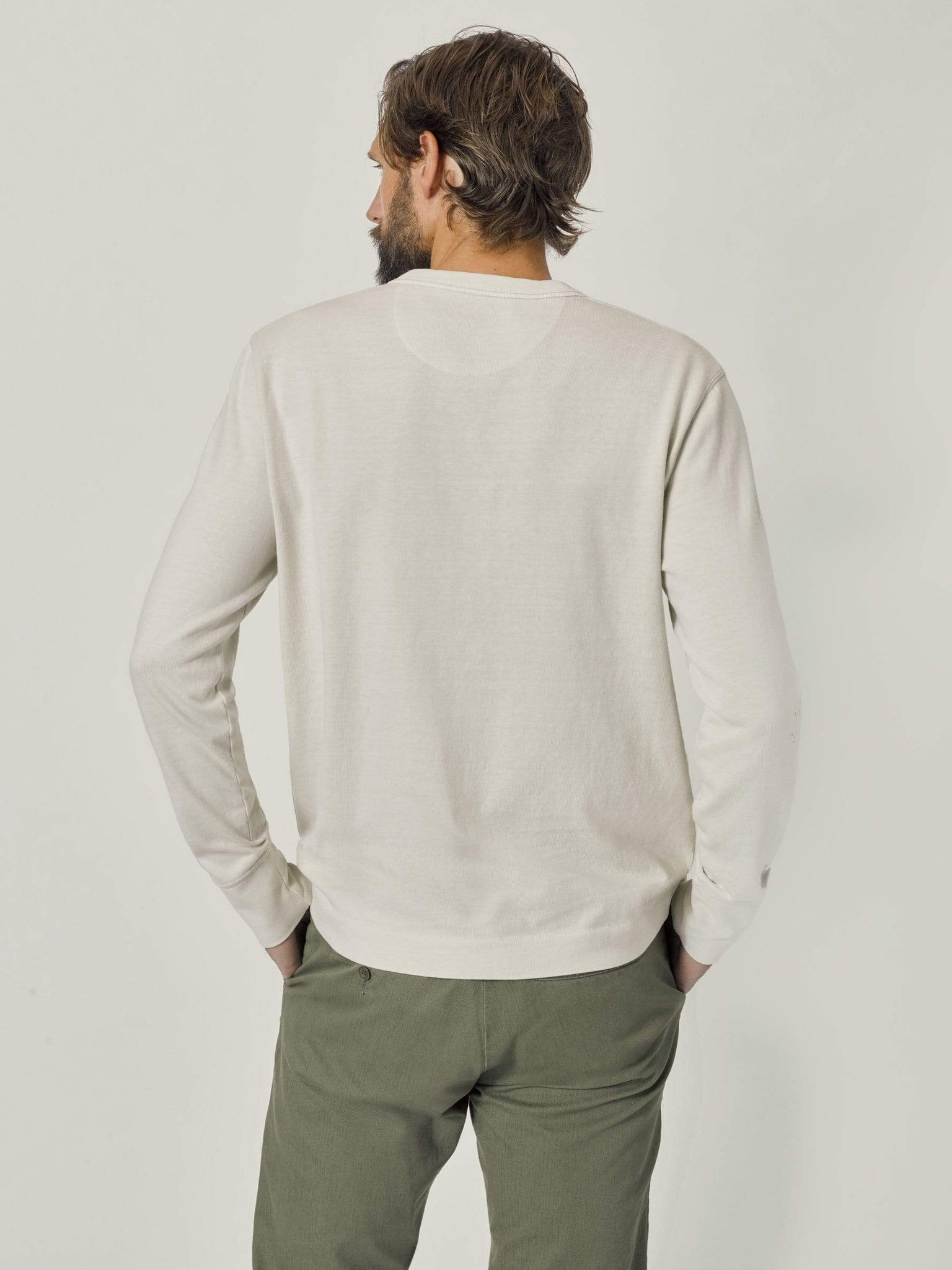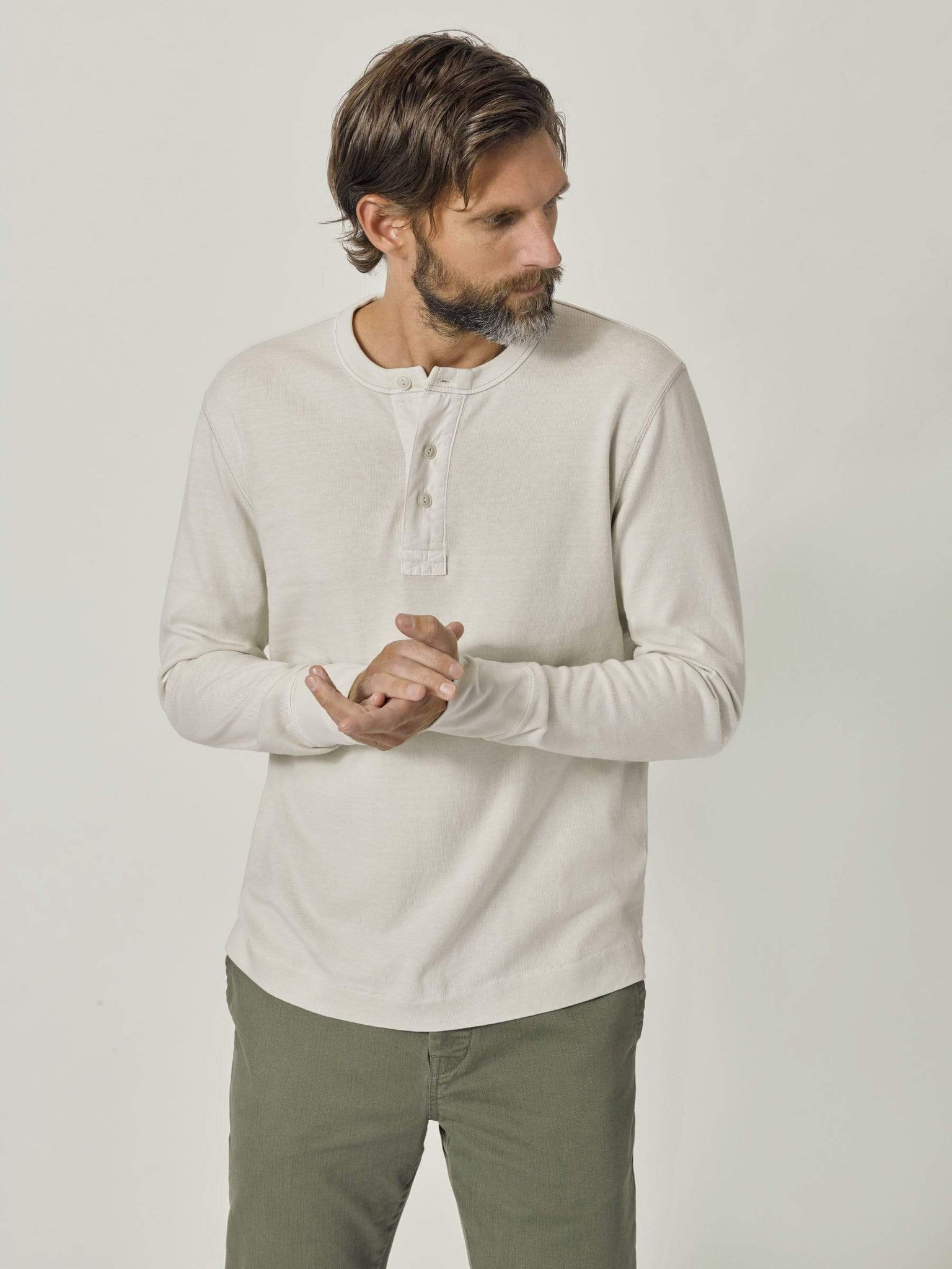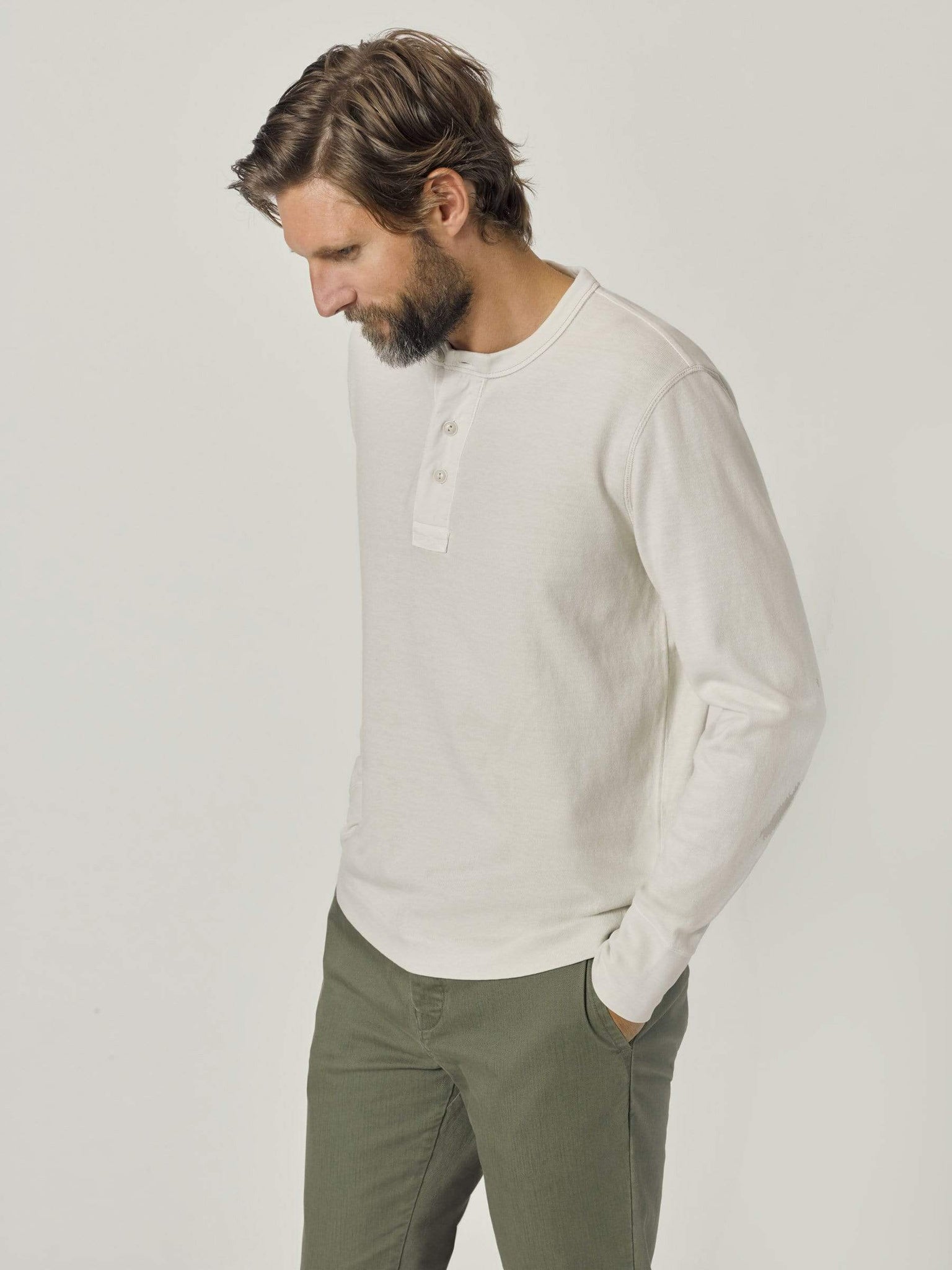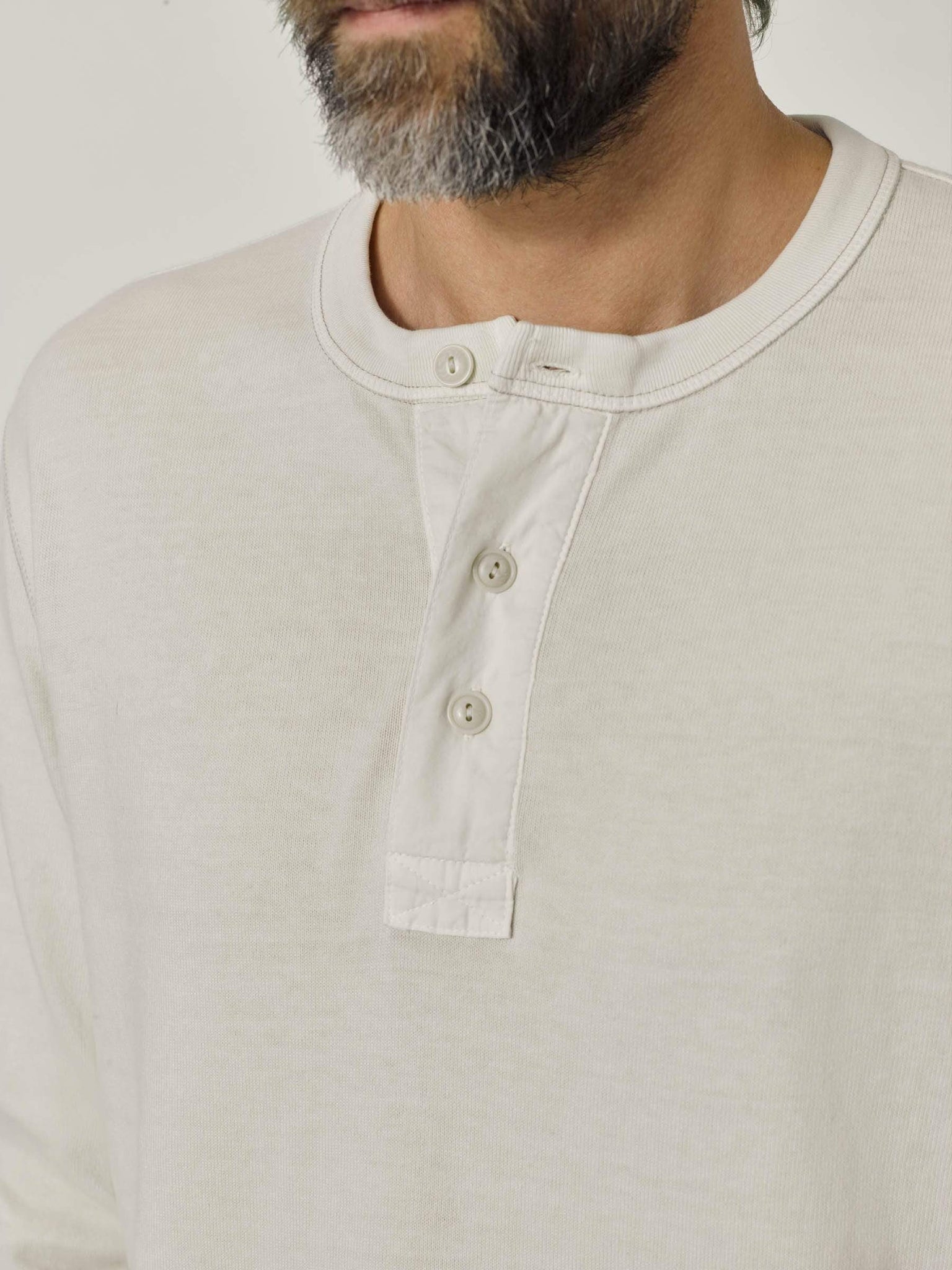 A loose-cut, long sleeve, heavy weight henley, modeled after a vintage athletic shirt. The soft, cotton jersey is about three times heavier than our Pima tee. This is a solid, substantial base-layer for colder weather.