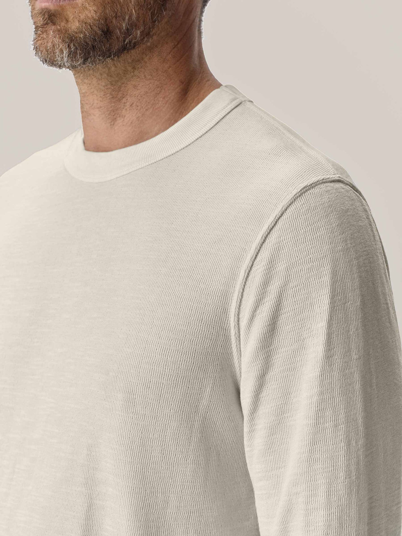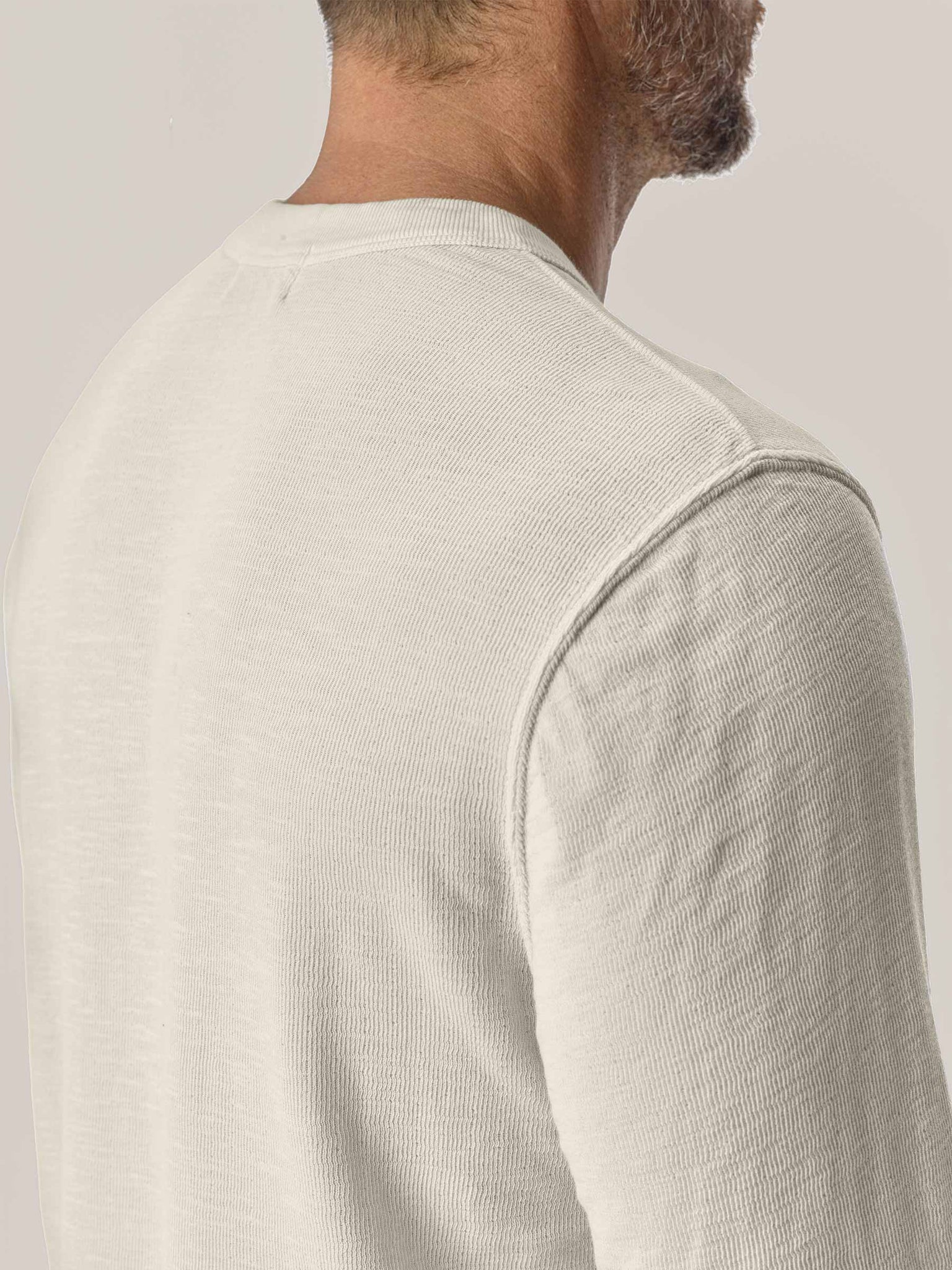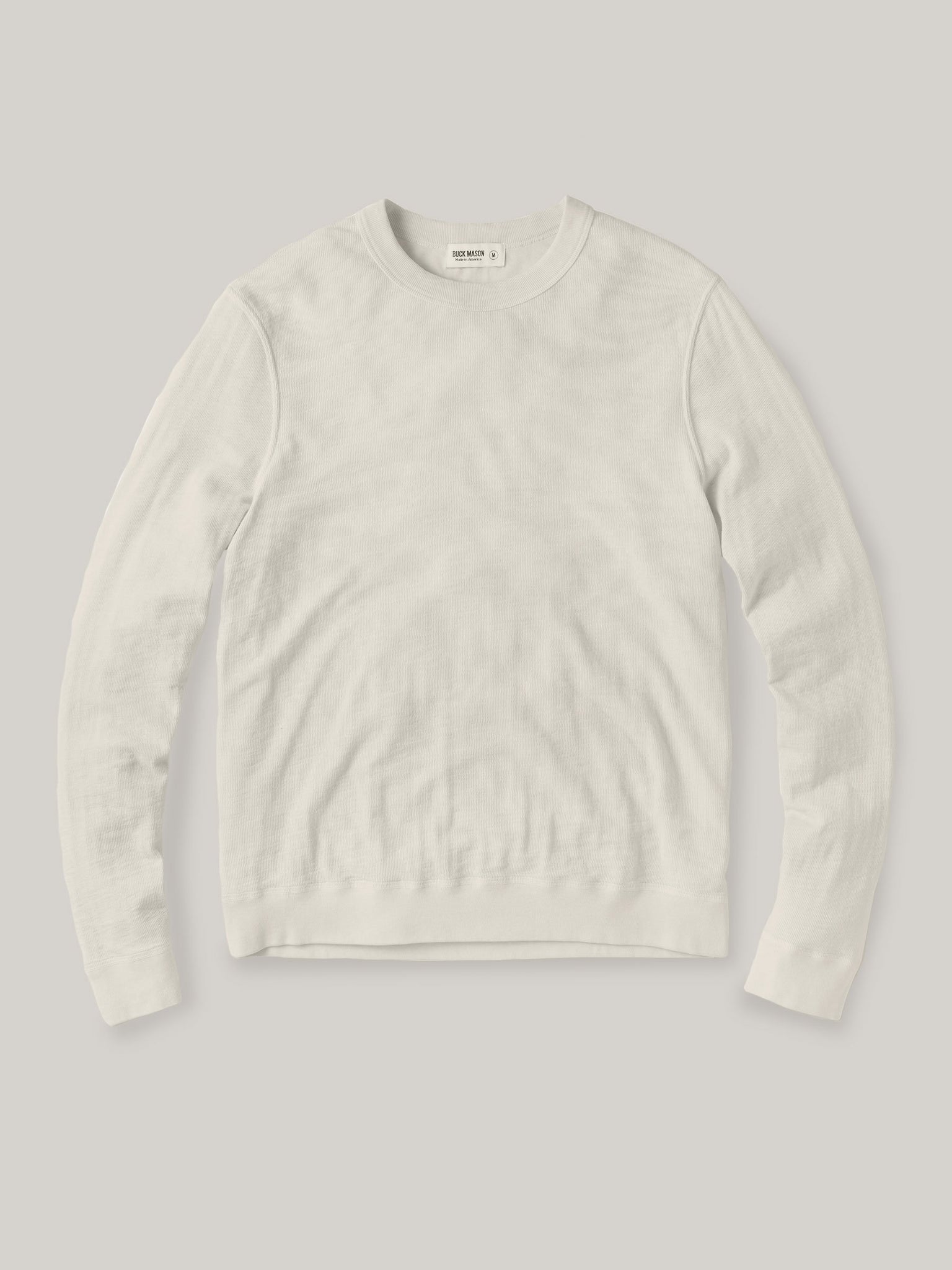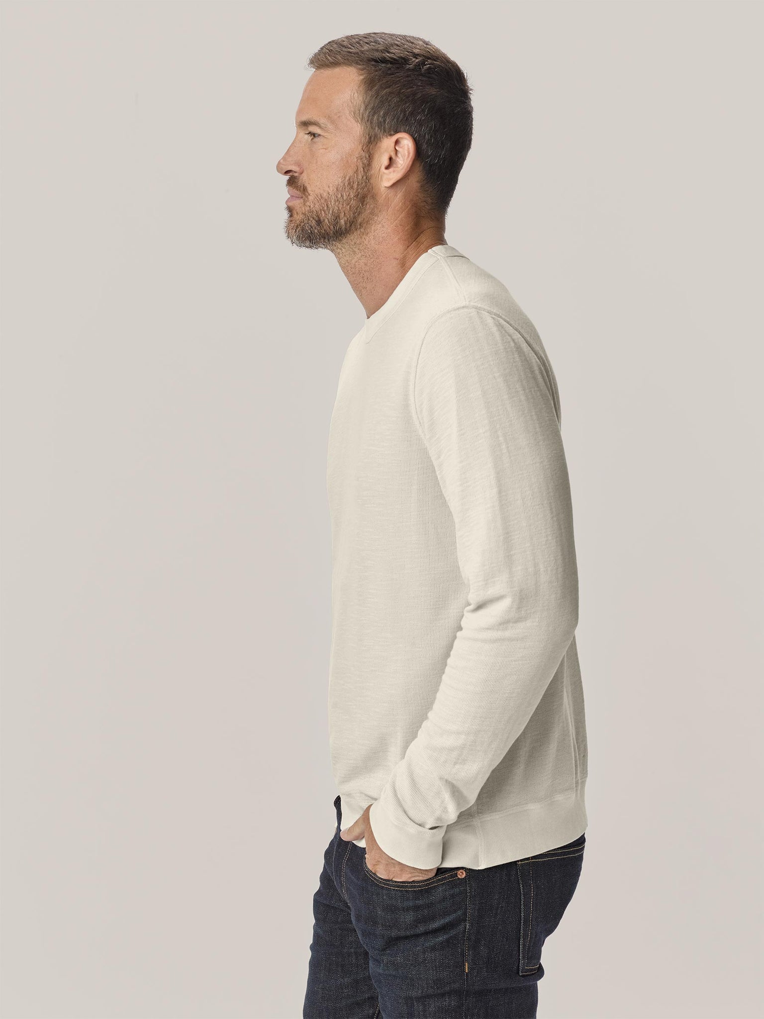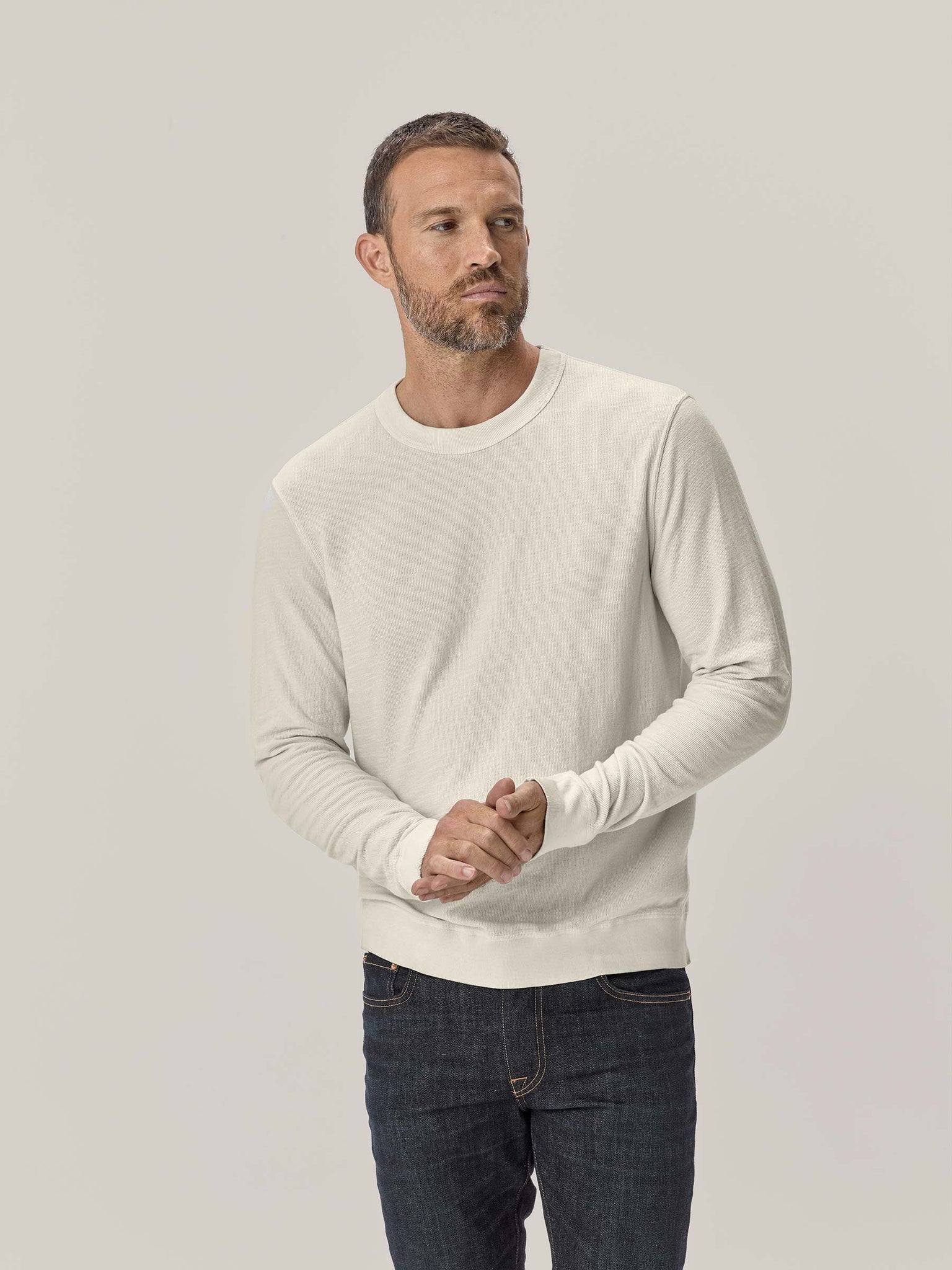 A loose long-sleeve sweatshirt cut from textured cotton. On the inside is a silky, brushed micro-jersey, and on the outside, a beefy slub cotton. The space between them traps heat and circulates warm air without overheating. The cut is modeled on an old-school crew sweatshirt that we dip-dyed in vintage colors.