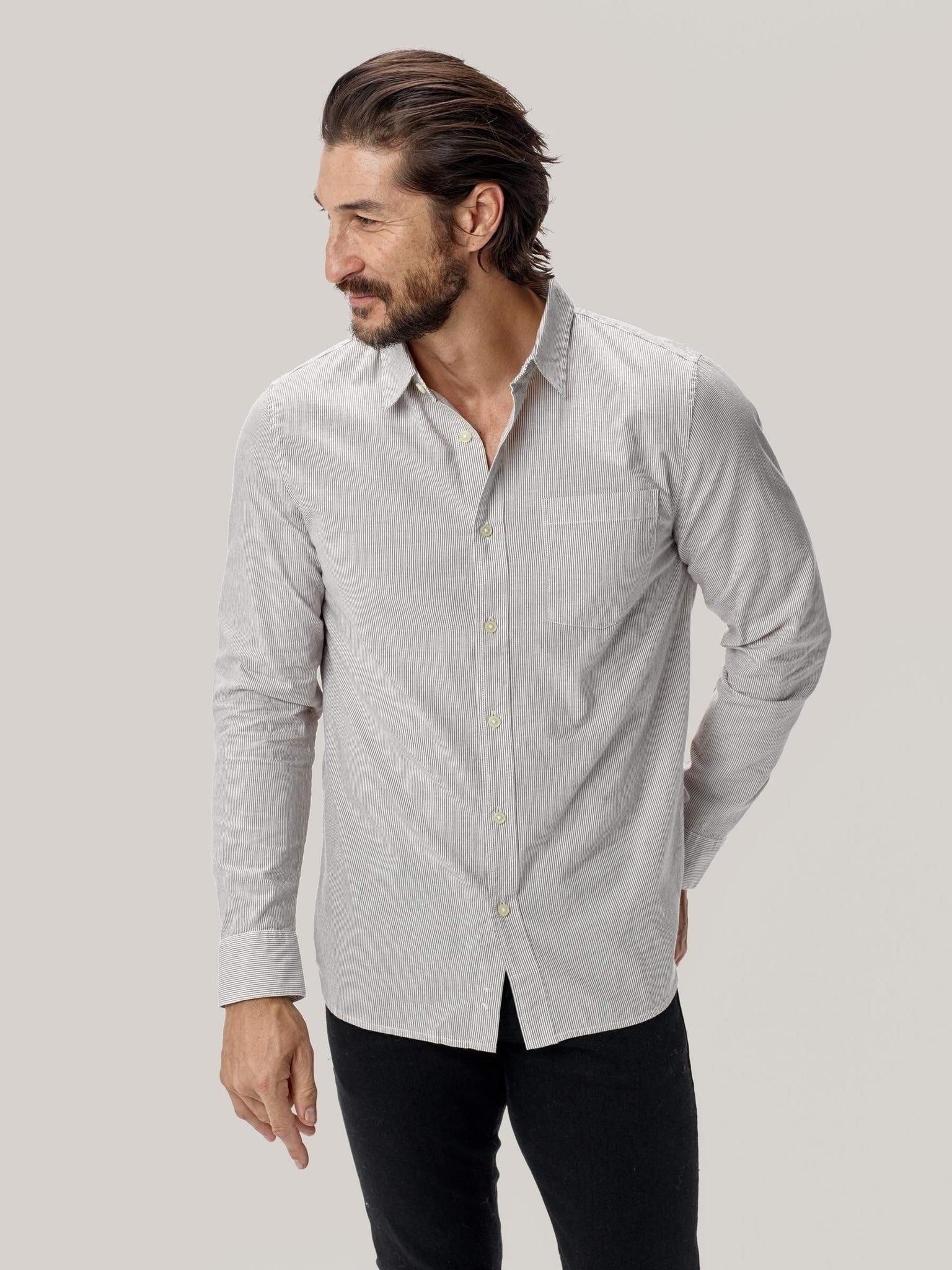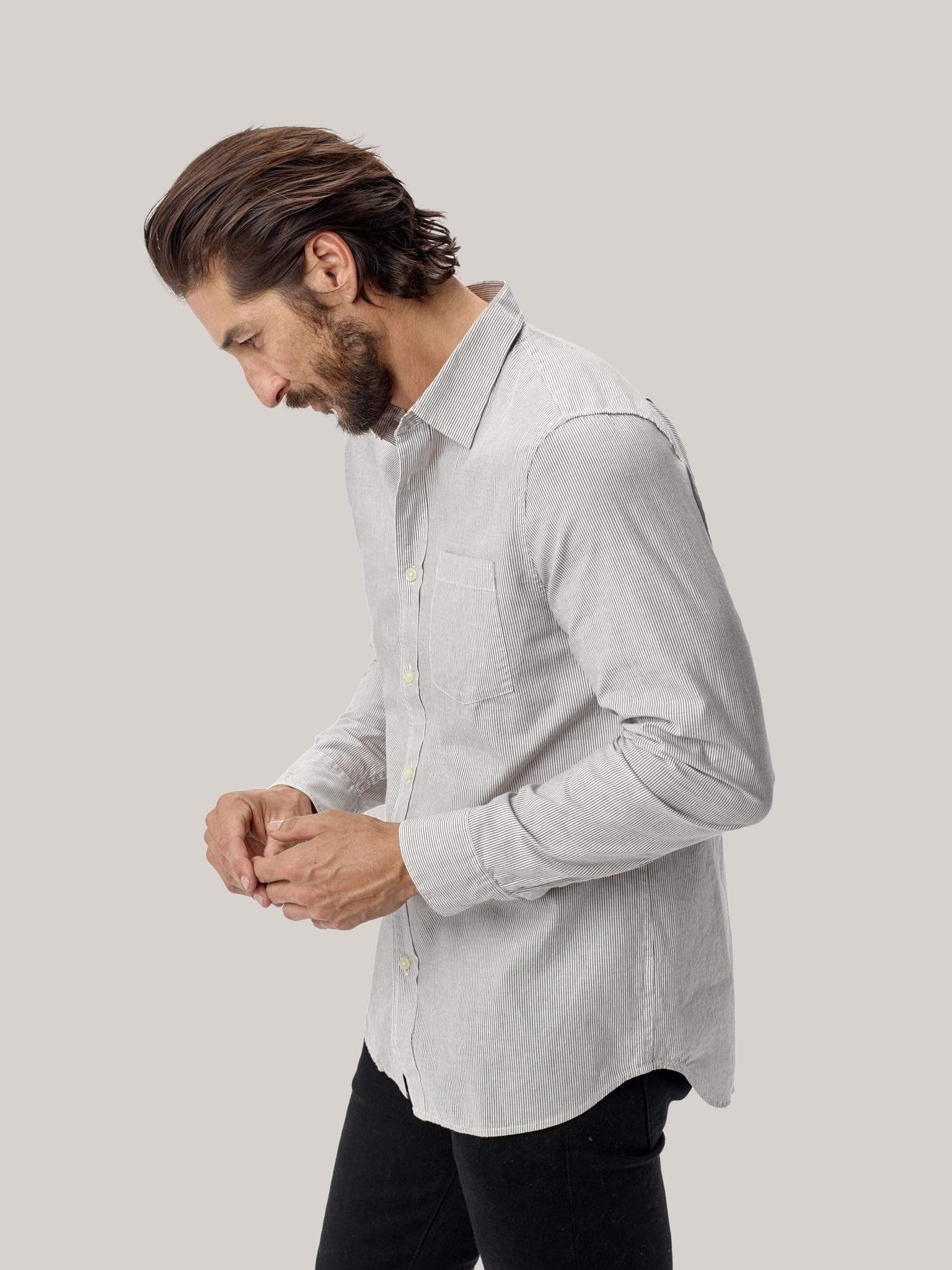 Old world manufacturing meets modern design. The fabric for our Rinsed Fine Stripe was made at a Japanese mill that’s been continuously operating for 200 years. Our pattern makers and sewers ensure all the stripes line up cleanly on the pocket and placket, and we placed darts at the shoulder for a clean silhouette with maximum mobility.