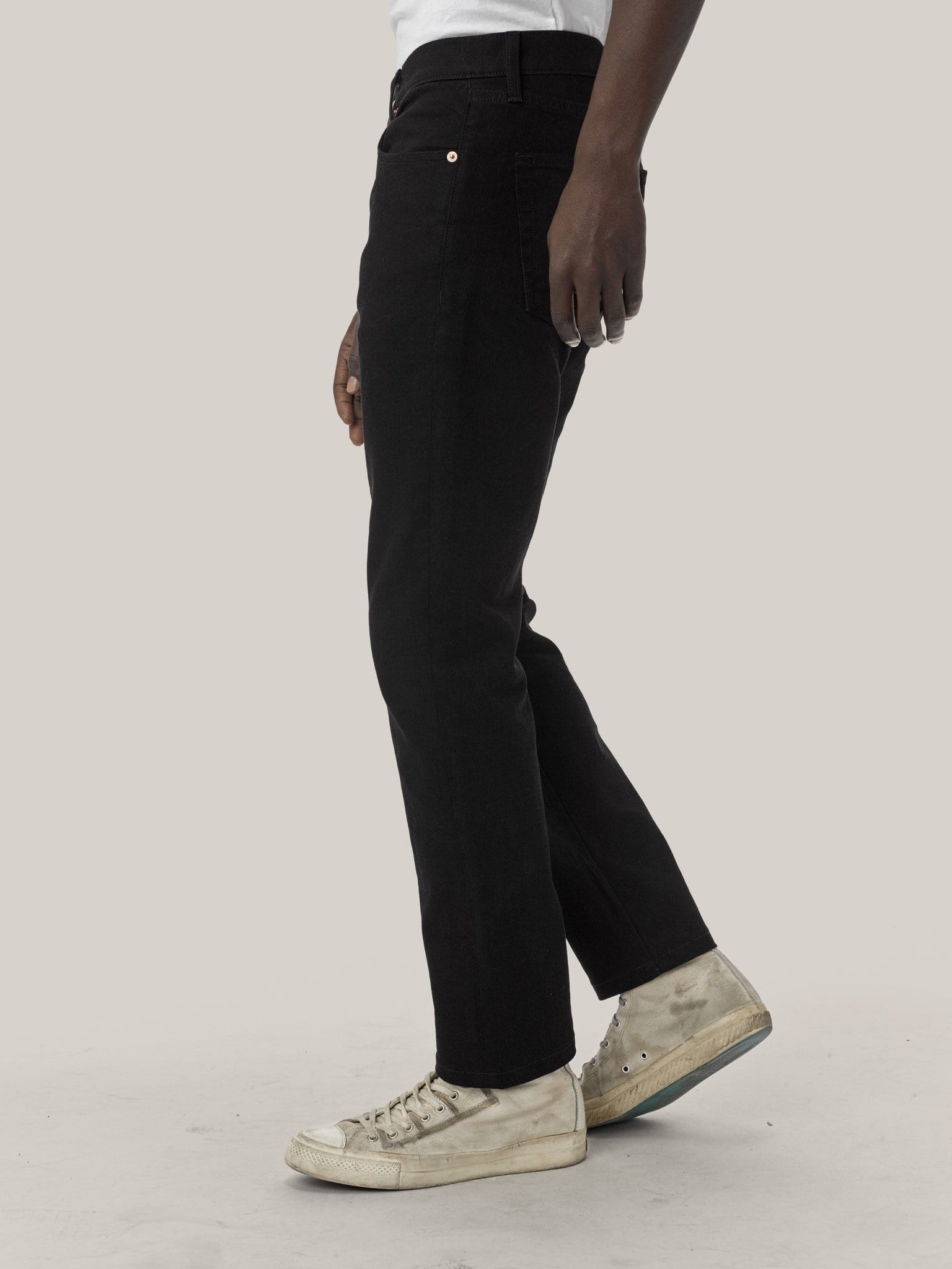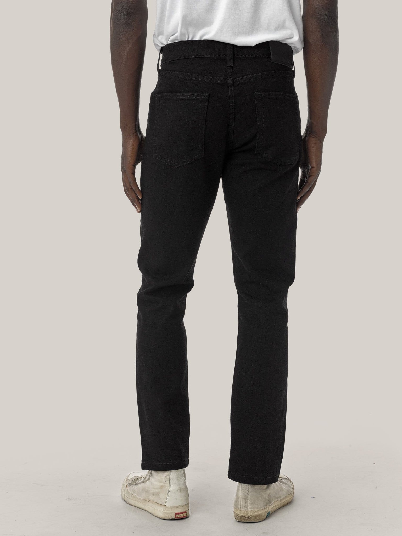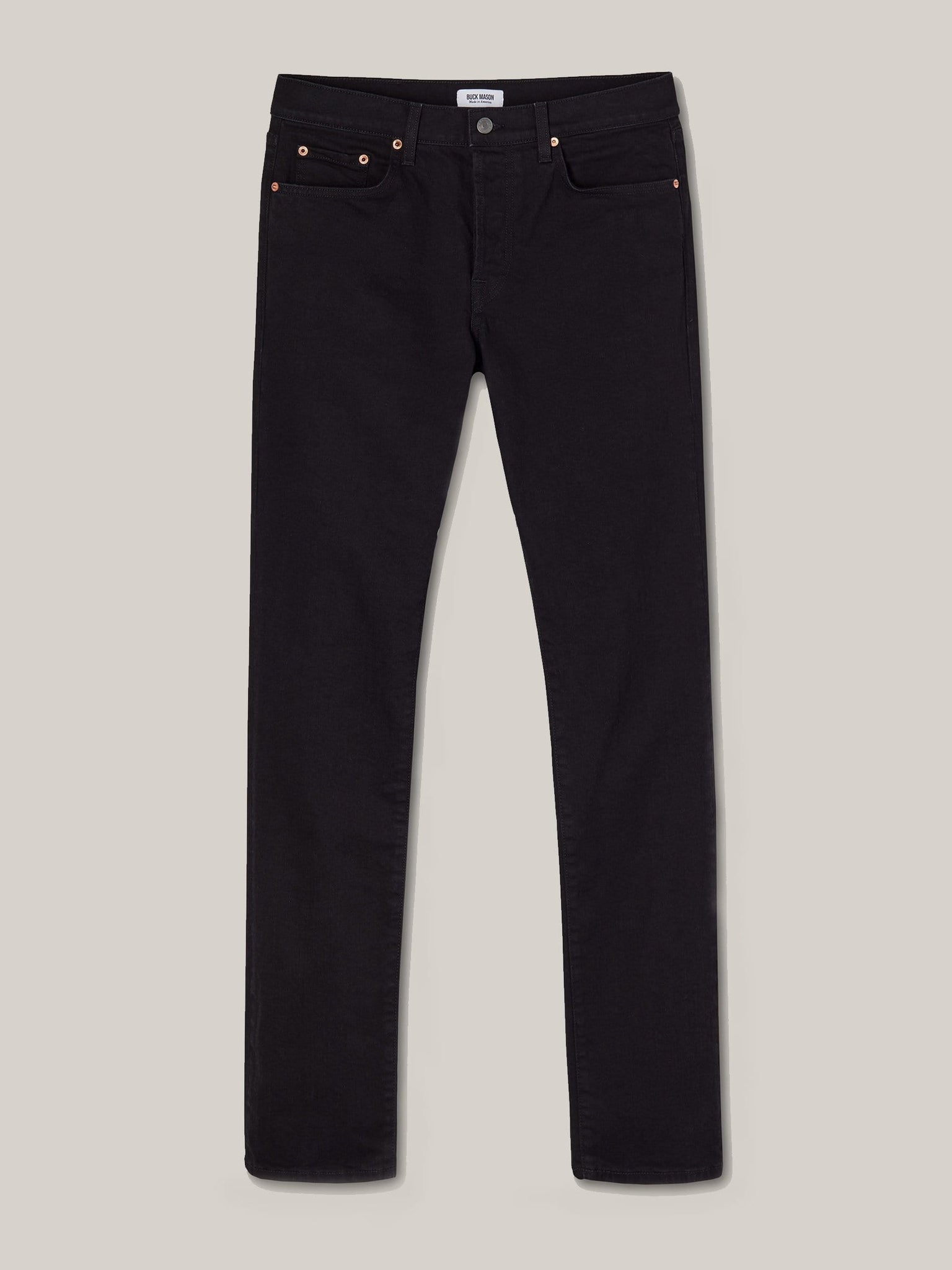 A comfortable stretch jean with the weight of our Raw Indigo Denim. You ever have that problem where your black jeans turn grey over time? That will never happen with these jeans. The yarn is dyed black, and then we over-dyed the finished jean. These jeans will stay pitch-black forever. Features our button ‘safety’ fly, nice tonal stitching, and our classic branding patch.